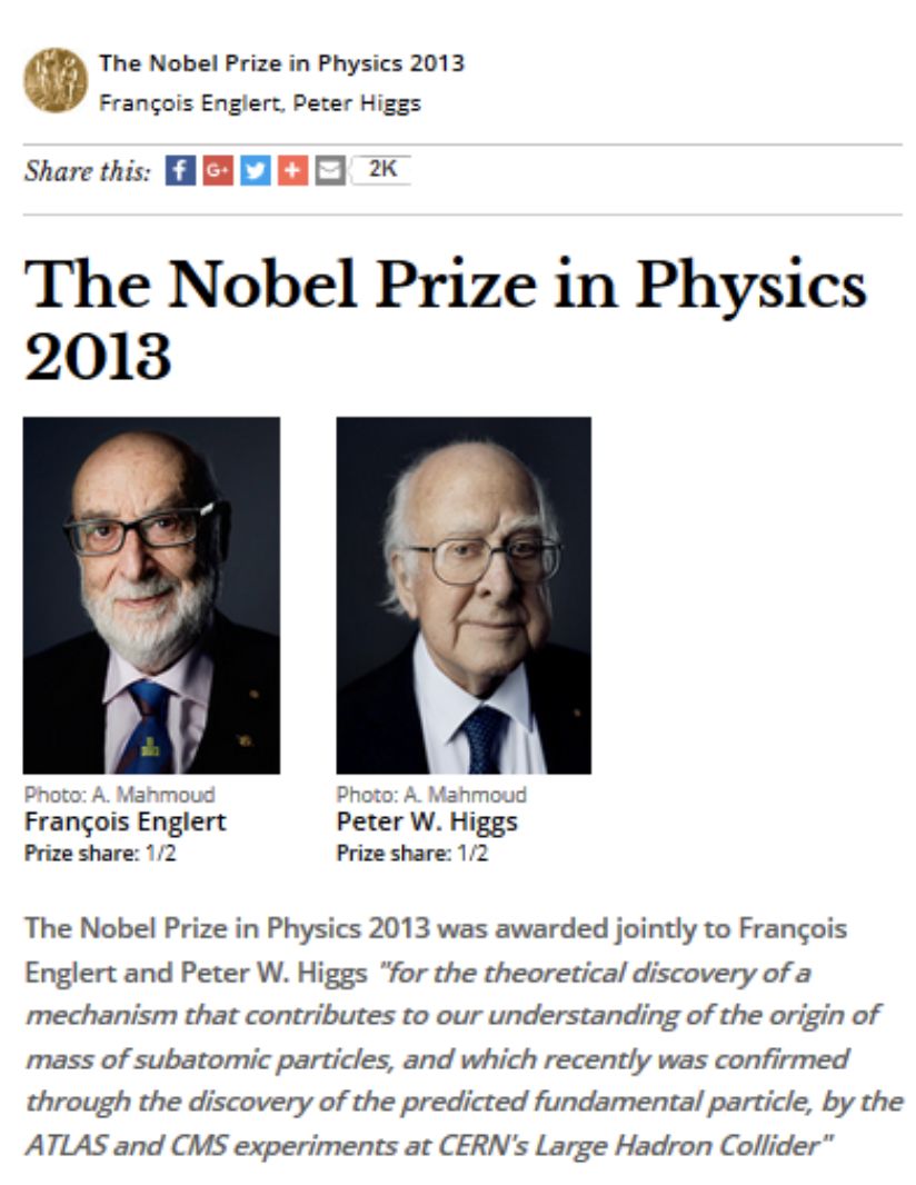 弗朗索瓦·恩格勒(François Englert)和彼得·W·希格斯(Peter W. Higgs)因为解释粒子如何获得质量的理论而共同获得2013年诺贝尔物理学奖。颁奖词为“在理论上发现了有助于我们理解亚原子粒子质量起源的机制,而且经由它所预言的、最近已经被CERN大型强子对撞机的ATLAS和CMS发现的基本粒子而得到了证实。” 图片来源:nobelprize.org