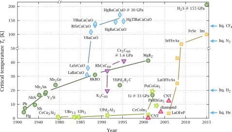 ○  1900年-2015年超导体的发现历史。绿色圆形:金属超导体;蓝色菱形:铜基高温超导体;橙色方块:铁基超导体。2015年,科学家发现,H₂S在155 GPa的超高压下,当温度降低到203 K(-70 °C)时转变为超导态,这是目前所知的转变温度最高的超导体。| 图片来源:Wikipedia