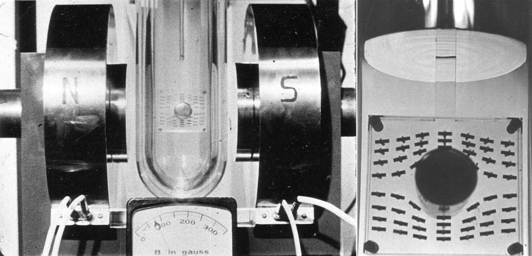 ○  超导体完全抗磁性的实验图。在注满液氦的杜瓦瓶中,圆柱体形状的金属锡被置于磁场中,当温度从4.2 K降低至1.6 K时,电磁铁的磁场强度保持不变,但锡在大约3K时成了超导体,可以从众多小磁极的指向中看到,磁通量被排斥到圆柱体之外。| 图片来源:Wikipedia