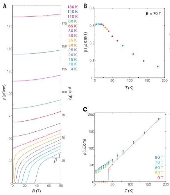 ○  (A)从4K到180K的一系列温度下,电阻率与磁感应强度的关系图。从图中可见,在普通金属态(高于转变温度,低磁场下的非超导态),电阻率与磁感应强度成正比。(B)电阻率-磁感应强度变化率(图A中的斜率)与温度的关系,可以看到,在低温下,电阻率-磁感应强度变化率趋向饱和,也就是说,电阻率与磁感应强度成正比。(C)从0T到80T的一系列磁感应强度下,在普通金属态,电阻率与温度成正比。| 图片来源:DOI:10.1126/science.aan3178