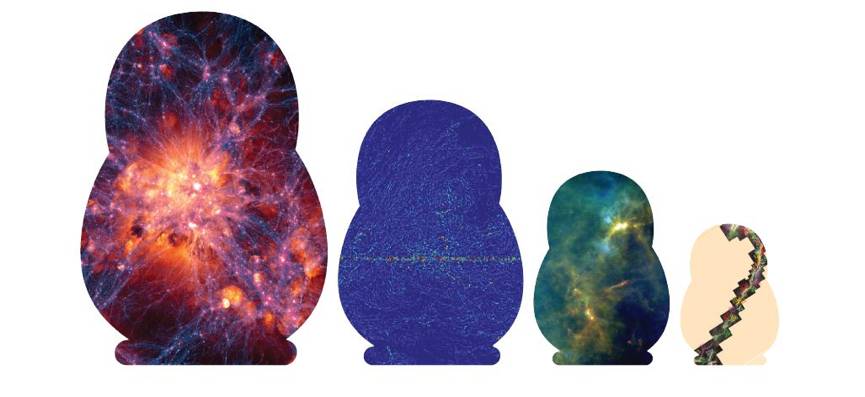 图2. 天体物理学俄罗斯套娃——纤维。从最大到最小各图及其版权:对星系际纤维的模拟(Lars Hernquist 及其合作者,Harvard);对银河系内中性原子氢的观测(P. M. W. Kalberla 等人);对分子云内的纤维的观测(ESA/Herschel/PACS/SPIRE/V. Roccatagliata, U. München);对(分子云)纤维中的纤维的观测(A.Hacar 等人)。