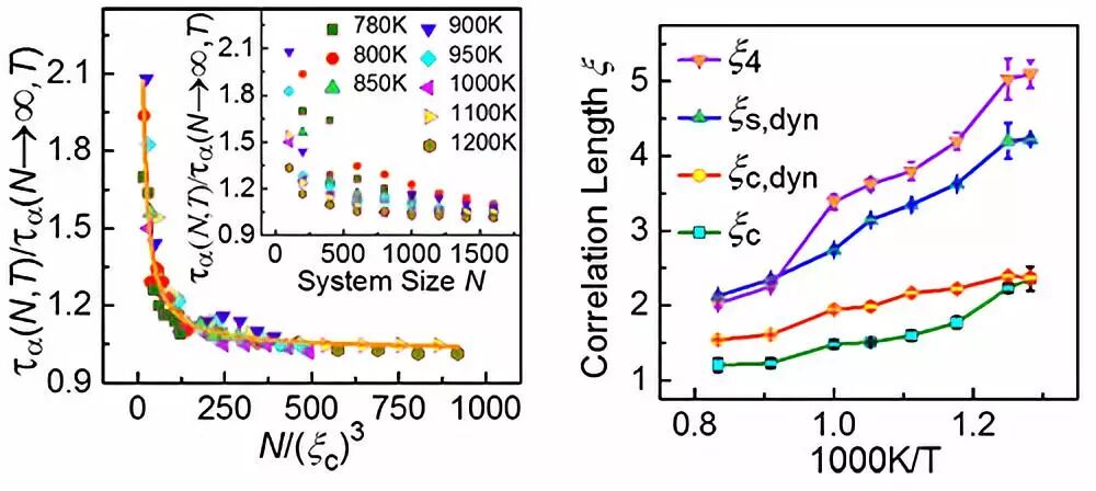 图 3 非受限状态下金属玻璃过冷液体的慢动力学与静态关联长度之间的有限尺度标度关系。
