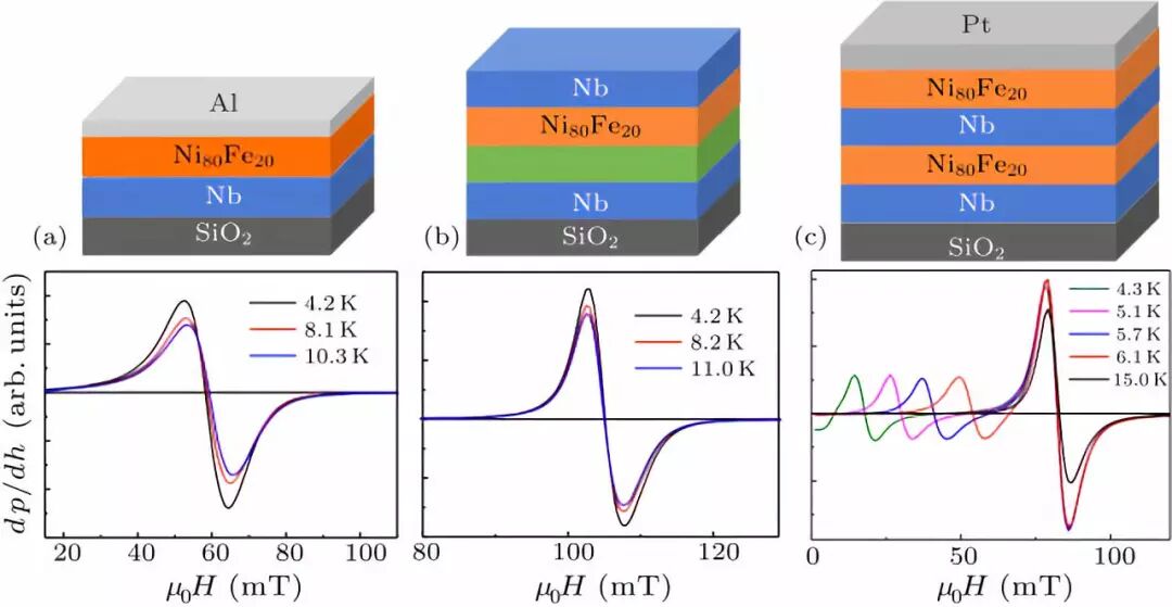 为了排除该效应可能来源于超导体的抗磁性(Meissner效应),他们做了一系列对比实验。首先,在超导/铁磁双层膜(Nb/Ni80Fe20)中,在超导转变温度TC以下,铁磁共振场Hr随温度降低几乎不发生移动。其次,当在超导/铁磁/超导约瑟夫森结中插入一层10 nm绝缘层(Nb/MgO/Ni80Fe20/Nb)时,TC以下铁磁共振场Hr也不再发生移动。此外,在超导/铁磁/超导/铁磁多层膜(Nb/Ni80Fe20/Nb/ Ni80Fe20)中,在TC以下出现两个铁磁共振峰,分别对应于两层铁磁层发生铁磁共振,其中一支随温度降低向低场移动,而另一支保持不动。这些对比实验表明:1.超导电性对磁化动力学的影响不是来自于Meissner效应;2.只有当铁磁体处于两层超导体之间形成约瑟夫森结时,超导电性才会对磁化动力学产生巨大影响;3.当约瑟夫森结中插入绝缘层不再导通时,该效应会消失,预示着该效应是与超导电流有关。由于自旋单态的正常超导电流不会对局域磁矩的动力学产生明显影响,因此,这一效应很可能来源于自旋三重态的超导电流产生的自旋转移力矩对磁化动力学的巨大影响