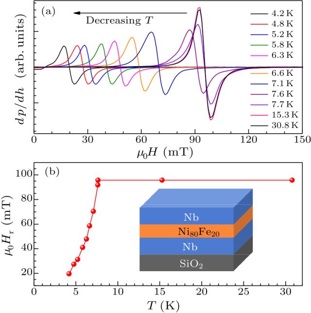 图2 (a)Nb(100 nm)/Ni80Fe20(20 nm)/Nb(100 nm)约瑟夫森结的铁磁共振谱。(b)铁磁共振场随温度的变化,在超导转变温度以下,共振场迅速朝低场移动。