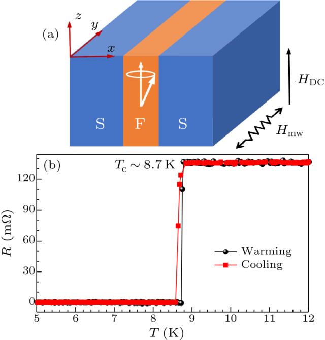 图1 (a)超导/铁磁/超导约瑟夫森结和铁磁共振示意图。(b)Nb/ Ni80Fe20/Nb约瑟夫森结中超导层Nb的电阻随温度变化曲线。