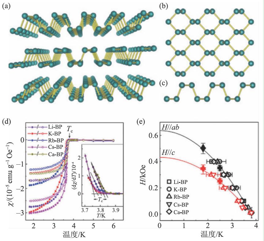 图6 (a)黑磷的晶体结构;(b)磷烯晶体俯视图和(c)侧视图;(d)Li、K、Rb、Cs和Ca插层黑磷随温度变化的磁化率曲线,超导转变温度对插层原子种类不敏感;(e)插层黑磷的平行和垂直临界磁场随温度的变化关系,插层样品具有基本相同的临界磁场