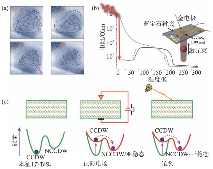 图10 (a)垂直正向电场引入的空穴导致的1T-TaS2的CDW畴壁消失;(b)光照导致1T-TaS2从CCDW 态到NCCDW 态或隐藏的亚稳态,并使电阻率降低; (c)1T-TaS2的CDW能垒示意图以及通过垂直电场和光场调控CCDW和NCCDW或亚稳态的示意图