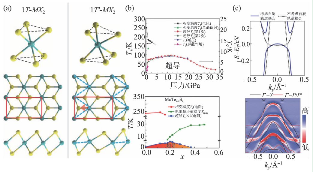 图13 (a)1T和1T'的结构示意图,1T'结构中红色箭头代表畸变方向;(b)压力和S掺杂诱导1T'-MoTe2超导相图;(c)单层的1T'-WTe2由于自旋轨道耦合造成的带隙打开和实验观察到的能隙