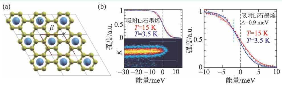 图4 (a)吸附金属原子石墨烯的结构,黄色球为碳原子,蓝色球为金属元素;(b)ARPES测量得到的吸附Li 石墨烯在K点附近的色散特性及其对应的强度,通过对强度的拟合得到了0.9 meV的超导能隙