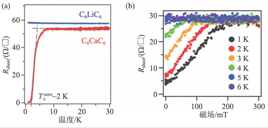 图5 (a)Li 和Ca插层的双层石墨烯的电输运曲线,Ca插层双层石墨烯显示了超导电性,而Li插层却没有超导电性;(b)Ca插层的双层石墨烯显示的抗磁信号