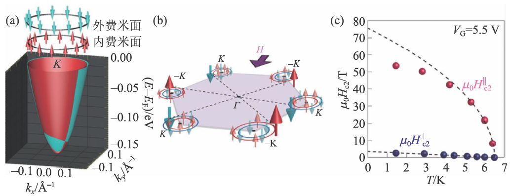 图12 (a)MoS2在K点附近的能带色散和自旋结构,由于有效的塞曼场,内费米面和外费米面具有向上或向下的自旋极化;(b)谷依赖的自旋极化费米面示意图,每个谷的自旋都垂直于磁场;(c)面内和面外的上临界场随温度变化的关系,面内的上临界磁场要远远高于面外的上临界磁场