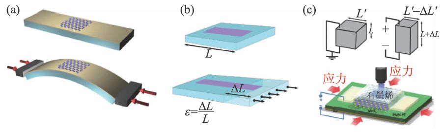 图2 (a)弯曲基底和(b)拉伸基底对二维材料施加单轴应力;(c)利用压电陶瓷施加双轴应力