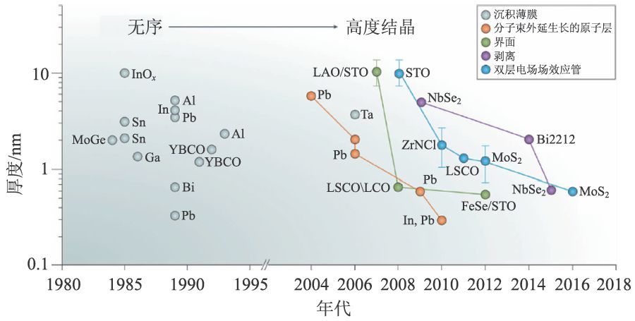 二维超导的研究并不是一帆风顺的,在二维材料里是否存在超导曾经是固体物理中最具有争议的问题之一。早期的理论认为,随着薄膜厚度的降低,体系中的缺陷及无序度也会相应增多,将会引起电子的局域化, 并影响超导库珀对(Cooper pair)的相位相干,从而抑制超导电性的产生。因此,早期理论认为理想的二维体系不存在宏观的超导电性。实验方面,1938 年Shal'nikov首次报道了Pb 和Sn 薄膜上的超导电性,开启了薄层超导的研究历史。在早期的研究中,绝大多数的准二维超导体都是由沉积的金属膜制成的,这导致了很多无序、无定型态或者颗粒状的样品。因此,准二维薄膜体系超导电性的研究以及所观测到的各种现象都受到了材料本身结构无序的影响。进入21 世纪,材料制备技术的发展,特别是分子束外延、机械剥离等低维材料制备手段的不断进步,使得二维超导材料的晶体质量得以大幅提高,并且可以实现原子级厚度的二维超导材料,从而极大地推动了二维超导电性的研究(图1)。