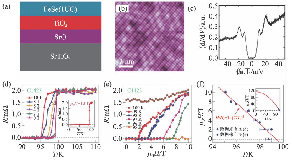 图8 (a)FeSe 在SrTiO3衬底上的示意图;(b)原子分辨的STM图展示了FeSe 由Se 构成的表面;(c) 4.2 K下的扫描隧道谱探测到的20 meV 超导能隙;(d)磁场和温度依赖的电输运特性,插图显示了10 T 下的输运曲线,表明单层FeSe 具有100 K的超导电性;(e)95—100 K下电阻随磁场的变化关系,显示了单层FeSe 的抗磁性;(f)临界磁场和温度之间的关系