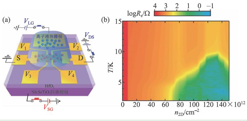 由于常见的二维材料(比如石墨烯、黑磷、MoS2等)本征的半金属或半导体的特性,需要对其进行调控才能够出现超导电性。目前,二维材料主要的调控超导的手段有化学吸附、应力和载流子掺杂等。通过弯曲或拉伸弹性基底的方式可以对二维材料施加单轴应力,而利用压电陶瓷或衬底之间的晶格失配可以实现双轴应力(图2)。场效应管可以在不掺入杂质原子的情况下给二维材料注入电子或空穴,避免了向材料中引入无序,也是一种非常“干净”的调控手段。但是传统的场效应管的调控能力有限,不足以将一般的绝缘体材料调控出超导电性。近年来,双层电场场效应管(electric double-layer transistors,EDLT)实验手段的发展使得载流子浓度得到很大的提高(图3),并能将很多半导体材料调控出超导电性。值得一提的是,由于二维超导的实验研究涉及材料科学、器件物理、仪器技术等学科,对实验条件的要求也十分苛刻,因此理论研究往往都是超前于实验研究,这一点与块状超导体研究中实验往往先于理论的情况很不同。另外,超导和维度本来就有着很强的关联,许多高温超导材料本身具有层状特性,比如铜基氧化物超导体、铁基超导体、MgB2、石墨插层超导体等。因此,二维超导研究对于发现新的高温超导材料也有非常重要的意义。