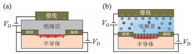 图3 (a)传统的场效应管;(b)双电层场效应管的示意图