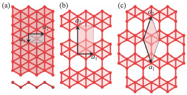 图7 实验合成的几种硼烯结构示意图(a)Mannix 等人合成的三角形结构的硼烯;Feng 等人合成的(b)矩形和(c)菱形结构的硼烯
