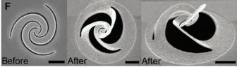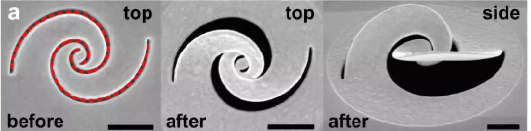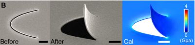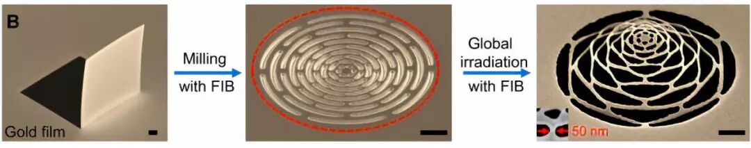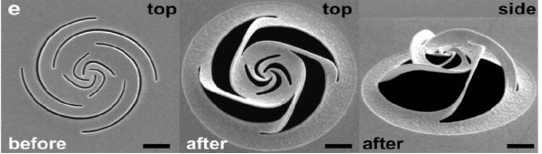 方绚莱团队用聚焦离子束切割仅有几十纳米厚的金属箔片。低剂量的离子束会使金属的晶体结构产生空隙,一些离子留在晶体中,使其结构变形,从而产生压力引起箔片的扭曲。