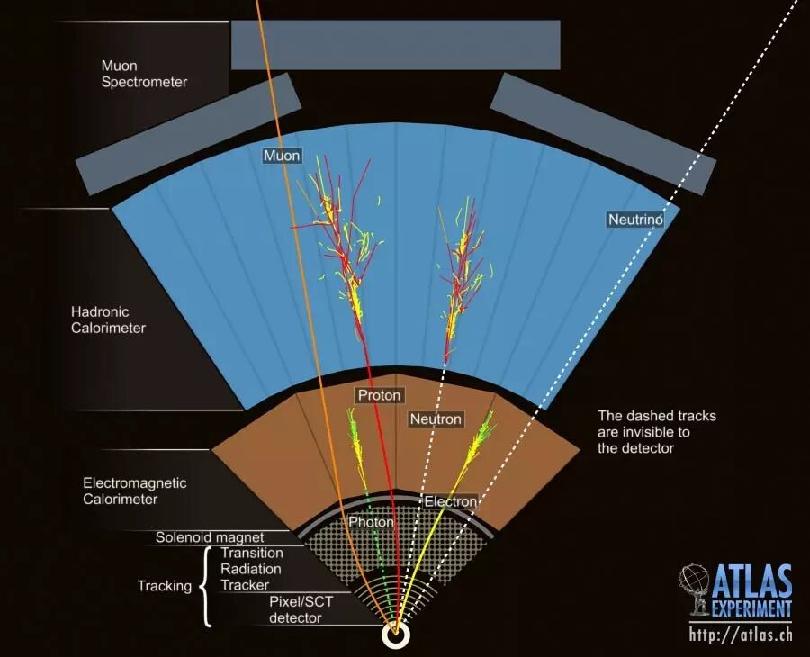 上图中的虚线表示探测器探测不到的粒子,比如中微子(Neutrino),因为中微子基本不与粒子作用。我们只能由缺少的物质或能量来推论中微子的存在。