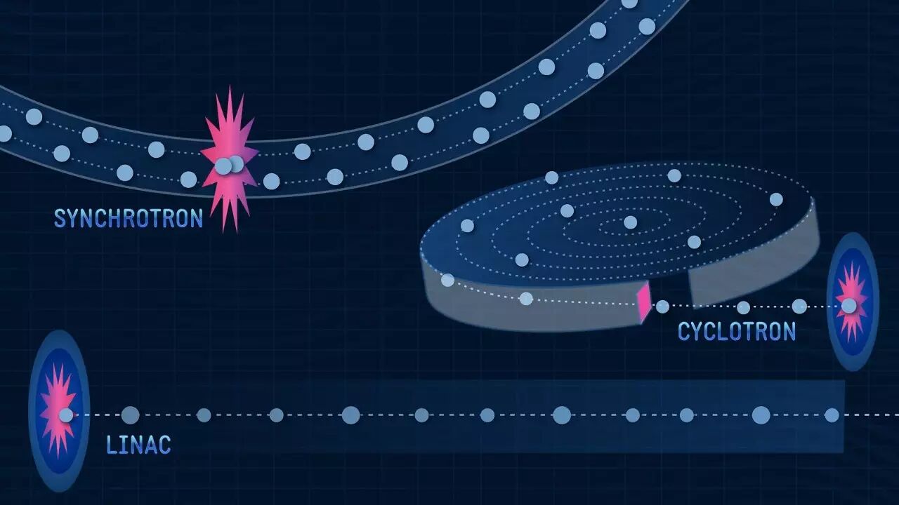 △ 三种不同的粒子加速器:同步加速器,回旋加速器和直线加速器。(图片来源: Sandbox Studio, Chicago with Ana Kova)