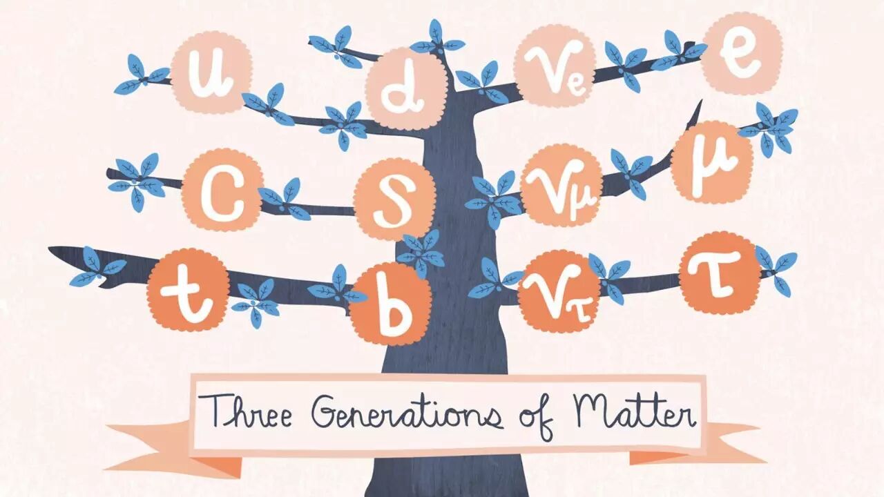 △ 费米子:左边是三代夸克上(u)、下(d)、粲(c)、奇(s)、底(t)及顶(b);右边是三代轻子:电子(e)、μ介子和τ介子,以及它们相应的中微子(ν)。(图片来源: Sandbox Studio, Chicago with Ana Kova)
