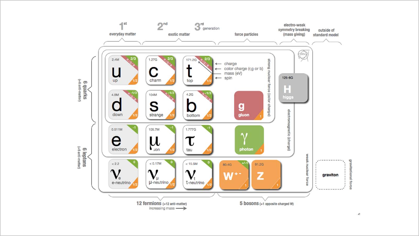 △ 标准模型:包含了六个夸克、六个轻子、以及玻色子。(图片来源:CERN)