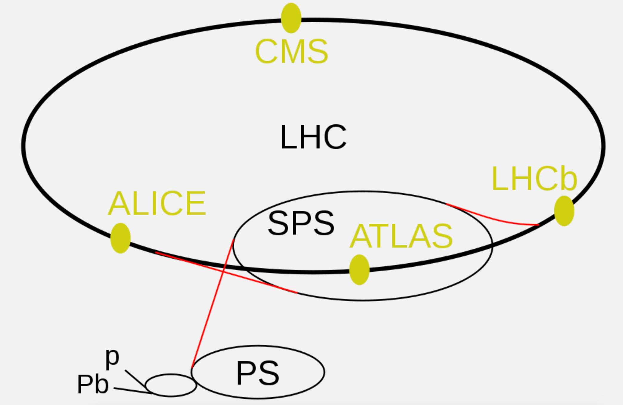 欧洲核子研究中心(CERN)的大型强子对撞机(LHC)是世界上最强大的粒子加速器。它将两束质子加速至非常高的能量,绕着周长27公里的环形轨道不断加速,并将它们进行对撞。对撞并不是发生在任意的地方,而是固定的对撞点,它们被探测器包围着。