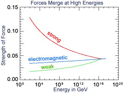 物理学家的夙愿是统一这四种基本力。在高能下,电磁力和弱核力的确已经被统一成电弱力。一些物理学家认为,在更高的能量下——远远超越了我们目前在实验所能达到的能量——强核力、弱核力和电磁力会统一成一个“大统一”的力。这样的一个理论被称为“大统一理论”(GUT)。