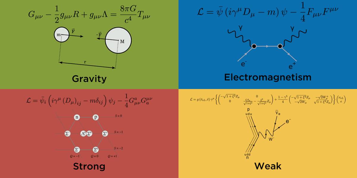△ 四种基本力:引力(Gravity)、电磁力(Electromagnetism)、强核力(Strong)和弱核力(Weak)。(图片来源:One Universe At a Time)