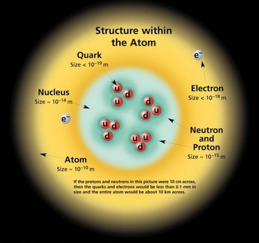 △ 原子的结构:中间的原子核由质子和中子组成,而质子和中子则由更小的夸克构成,围绕着原子核的是电子。(图片来源:CERN)