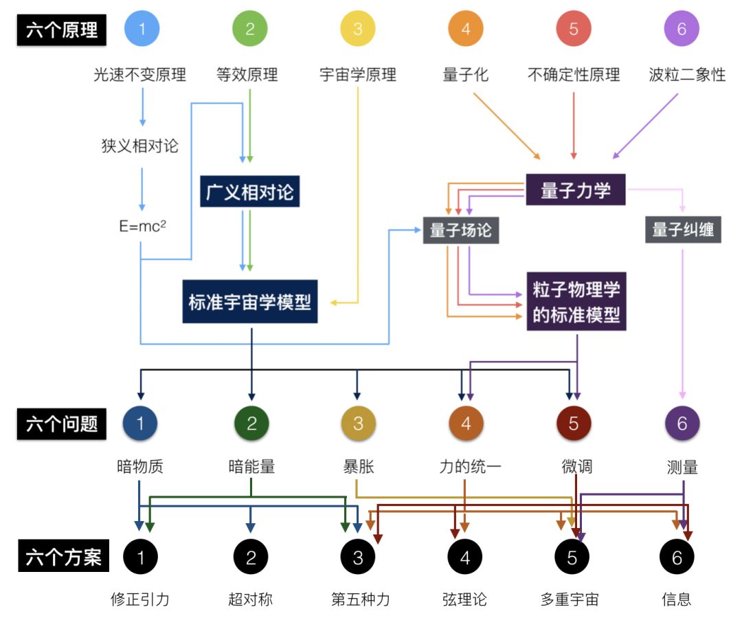 ○ 物理学的六个原理、六个大问题、及六个解决方案。详见:《物理学的六个基本原理》《面对这六个问题,物理学家寝食难安》《这六个物理学的前沿研究,哪个会叩响新物理的大门》