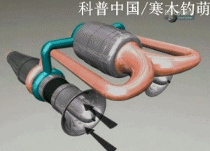 冷空气从右下方抽入,通过上图的绿色管道,经过熔盐堆,被强力加热后,从红色管子流向发动机尾部,向后高速喷出,以提供推力。