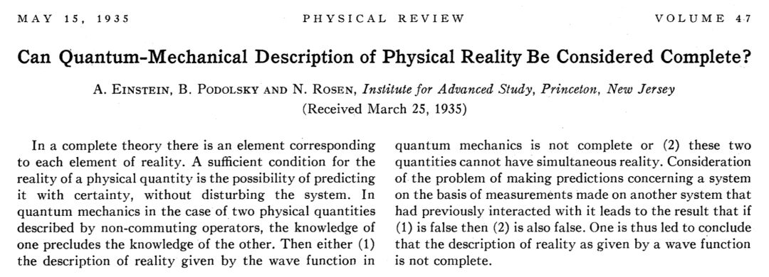 ○ 1935年爱因斯坦等人发表的论文,EPR是以三位作者名字的第一个字母命名的。该论文被物理评论快报评选为125年来最重要的论文之一,详见:《125年来,物理学都取得了哪些突破性的进展》。| 图片来源:Physical Review