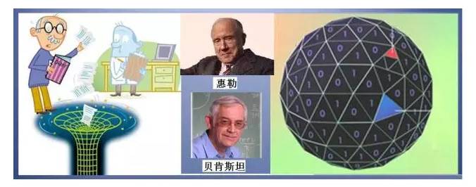 因为熵是复杂性的度量,那么,贝肯斯坦的假设也就意味着,视界表面积的大小可以量度黑洞的复杂程度,也许黑洞的复杂信息就留在视界面上?换言之,黑洞可能并不是一个“健忘者”,它将它吞进去的物体的复杂信息全部都写在了视界的表面上,见图1右图。