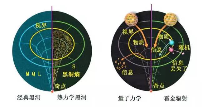 ►图3:(a)经典黑洞和黑洞熵(b)霍金辐射与量子力学的矛盾