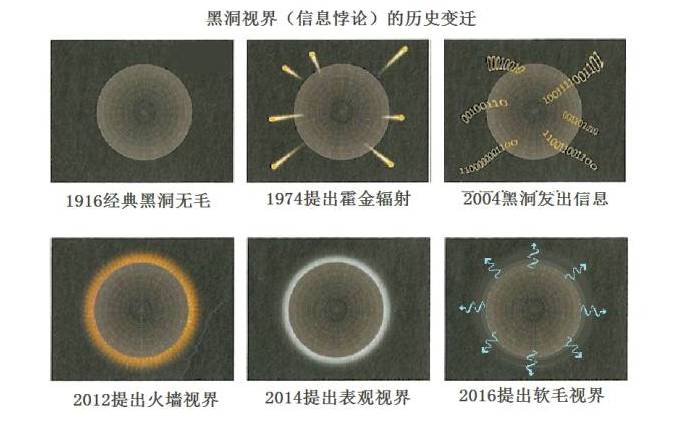 图4列出了从1916年广义相对论预言黑洞开始,到之后的黑洞信息悖论,对“黑洞视界”的描述所历经的几个关键年代。本世纪初,随着物理学特别是弦论的发展,越来越多研究人员认为,掉入黑洞中的信息会在黑洞消失时逃逸出来,这些讨论迫使霍金于2004年接受了这种观点,尽管他仍然不清楚信息是如何逃逸的。