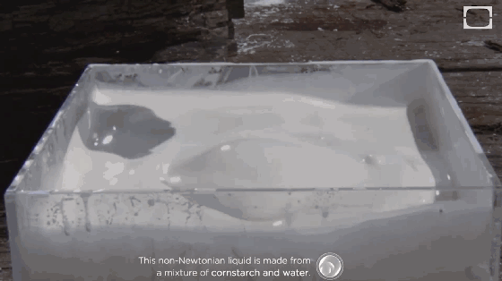 非牛顿流体,是指不满足牛顿黏性实验定律的流体,它广泛存在于生产生活和大自然之中。图中的玉米淀粉糊便是最常见的非牛顿流体之一,它“遇强则强”,施加的外力越大,它便会表现得越“坚硬”。当然还有很多其它种类的非牛顿流体,性质也千差万别。