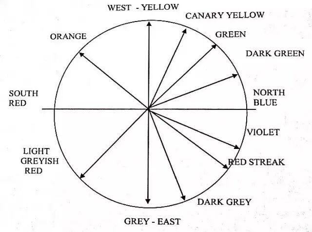 磁铁的每个位置对于地球场都是一种颜色。上图归纳了全部方向的颜色。它表明,每个角度对应着一种颜色的精微能量,来源于von Reichenbach的超视觉人士试验所报告的。