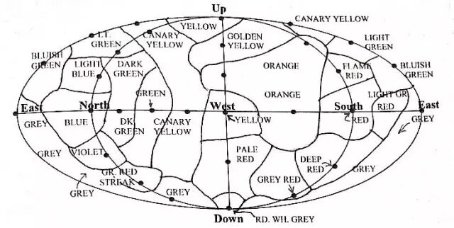 条形磁铁的北极(寻北极)在不同方向上发出的od颜色。南极(寻南极)的颜色地图实际上是一致的,这展示了在地球场中的方向是优势效应。这个图汇集了von Reichenbach收集的所有的od火苗颜色与在三维空间中的对应的方向的数据。磁铁可以转动到任何方向。该图描绘了磁铁指在一个方向上出现的颜色,展示在球体表面上,从东方的轴上切开然后伸展放平,并且从图的两个极端延展出来。
