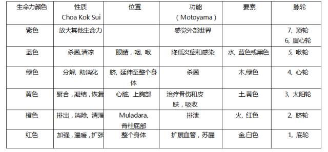 各种传统文化中和不同治疗师的描述会存在差异,对颜色和细微性质的感觉取决于治疗师的意识。因此下表用一般的方式总结了不同颜色生命力的倾向性。它也与传统的脉轮序列相符合。
