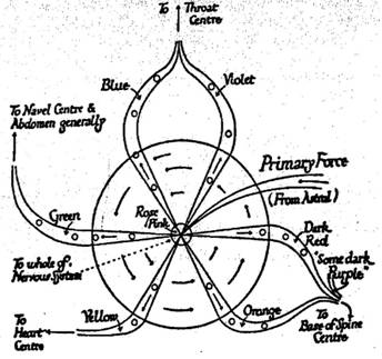 脾脏中心的流动导致向外的流动从七个降低到五个。如下图所示。向上朝着喉部中心移动的生命流流由紫色和蓝色的生命力流组成。同样,朝向脊柱底部中心的流动的生命力流由暗黑色和橙色的生命力构成。所以,在体内运行的七个基本的颜色的生命力降低到五个。