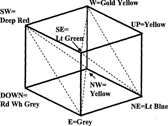 下图将同样的数据画在一个立方体的表面上,其相关性与意识的其他要素一致,例如气味和情绪。“上”意思是磁铁的北极处于垂直方向。例如,当这个磁极指向西,看到火苗的颜色是黄色。当磁极指向南,火苗的颜色是红色,当磁极垂直向下,火苗的颜色是“带有红白的灰色”。