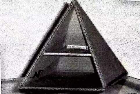Rich Berry制作的金字塔剃须刀片磨刀器模型。侧面和地面是用瓦楞纸板做的。底面的箭头指向北方。金字塔的西侧临时性移开以展示剃须刀片,三个刀片对准北侧,并且刀刃朝下。当使用金字塔的时候,图中打开的一侧是关闭的。(Berry,2011)