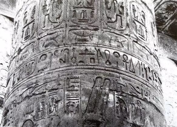 Claude A. Swanson曾游览了金字塔和尼罗河边的一些寺庙。这些地区的很多地方仍然保留了一些象形文字的碑文。下图展示了一个典型的例子,这些碑文被雕刻在卢克索的Karnak寺庙的柱子上。他认为,埃及人非常重视象形文字,他们相信形状可以传递超出文字本身的含义。他们认为,符号的形状会和其他符号产生共鸣,保持它内部的含义并传递到宇宙中去。