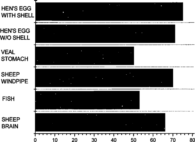 各种不同的肉类在金字塔内的脱水程度。(Bovis, 1971)