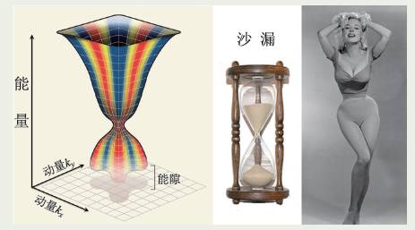 图7 铜氧化物高温超导材料中的“沙漏型”自旋激发、真实的沙漏和“沙漏型”女性身材(来自www.nature.comwww.parisciel.com)