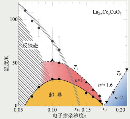 在不同掺杂区域,除了超导电性在不断变化之外,电子的实际状态行为要复杂得多。我们可以从更精细的电子态相图来一窥端倪(图3、图4)。对于空穴型铜氧化物高温超导材料来说,电子的电荷、自旋、轨道都可能形成有序态。母体中的反铁磁序就是一种自旋有序态, 随着掺杂增加,反铁磁序会不断被抑制,也有可能转为自旋序的另一种状态——自旋玻璃态,自旋在宏观上无序,但在局域范围看似有序。超导是电荷和自旋的共同量子有序态,担负超导重任的仍然是和传统金属超导体一样的库伯对,它们是自旋相反、动量相反的“ 比翼双飞”电子对,共同凝聚到了稳定的低能组态。在超导区域的上方和下方,都可以形成若干电荷有序态——电荷密度在空间分布存在不同于原子晶格的周期。在欠掺杂区域还可能会形成电子轨道有序态。最令人头疼的是,超导区域上方,也就是临界温度之上的正常态区域,有所谓的“赝能隙态”、“奇异金属态” 和“ 费米液体态”等等,其物理性质的复杂性甚至可能超越了我们对金属电子态的理解,在后文我们将略为介绍(图3)。如此之多的各种有序电子态,可以归因于零温下因掺杂浓度变化诱导出的相变,对应的掺杂点又称之为量子临界点,可能(只是可能,且不限于此)的临界点如图3 中标的pmin、pc1、pc2、pmax等[6]。电子型掺杂铜氧化物高温超导材料的精细电子态相图要相对简单一些,它没有那么多奇怪的正常态行为,但仍然保留反铁磁态和超导态,两者之间还存在共存区域(图4)。当然,如果仔细研究La2-xCexCuO4正常态下的电阻行为,也会发现电阻的温度指数n在不同的掺杂区域是很不一样的,三者可能交于一个量子临界点xC。类似的费米面的掺杂演变也趋于另一个临界点xFS[7]。