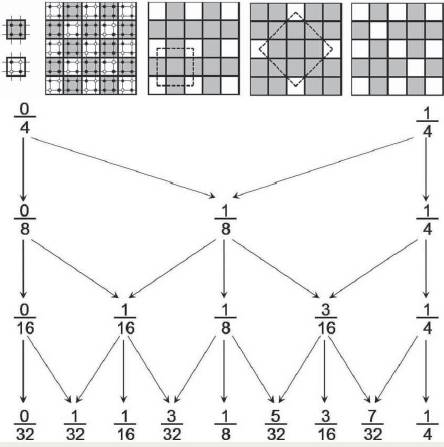 怎么样,单看这么些奇奇怪怪的电子态,已经够令人头疼不已了吧?事实的真相远非如此!以上介绍的只是冰山一角。举例来说,由于空穴型铜氧化物中的空穴位置并不总是随机分布的,在某些情况下会串联在一起,并且形成固定的分数周期结构。在这种结构下,电荷、自旋、晶格都会形成特定的有序态,称之为“条纹相”(图5)[8]。如果我们再足够细致地去研究相图的话,还会发现超导区域并非是以最佳掺杂为轴心严格对称的。而且在某些特定的掺杂点,超导甚至会突然消失,如La2-xBaxCuO4 的x=1/8掺杂点,其实就是形成了条纹相[9]。也有某些掺杂点的超导电性特别“皮实”,雷打不动,周围的掺杂点通过退火等方式稍微调节一下就会落到这些掺杂点上,称之为“魔数”掺杂点。根据材料中空穴和电子的分布,结合晶格的对称性,可以用数学的方法推断出“魔数”载流子浓度分别对应(2m+1)/2n(m、n 均为整数)一系列奇怪的分数(图6),1/8 不过是其中之一!似乎冥冥之中,铜氧化物的高温超导电性由某个“魔法大师”在幕后控制[10]。