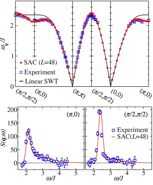 图 2. (上)量子蒙特卡洛+随机解析延拓(QMC+SAC)计算出的磁振子色散关系与Cu(DCOO)2.4D2O 材料中子散射实验结果的对比,吻合近乎完美。同时线性自旋波的计算结果 (Linear SWT),对于反铁磁长程序的描述,在(π, π) 点附近没有问题,但是在 (π, 0) 点附近失效。这是因为自旋波的计算中,无法考虑分数化的自旋子激发。(下)随机解析延拓(QMC+SAC)计算出的能谱与Cu(DCOO)2.4D2O 材料中子散射实验结果的在(π,0) 和 (π/2, π/2) 点的细节对比。可以看到在 (π, 0) 点除了 δ -函数之外,高能连续谱占有相当大的谱权重;而在 (π/2, π/2) 点,谱权重都集中在 δ -函数里。