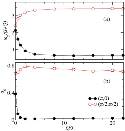 图3. QMC+SAC计算出的自旋波能谱在 (π,0) 和 (π/2, π/2) 点的行为。(a) 为磁振子谱峰的位置,(b) 为磁振子的谱权重。可见随着 Q/J 的增大(系统越来越靠近去禁闭量子临界点),(π,0) 点的磁振子谱权重急速消失,系统的低能激发从整数自旋 (S=1) 的磁振子变成分数自旋 (S=1/2) 的自旋子。(π/2, π/2) 点则没有这样的变化。